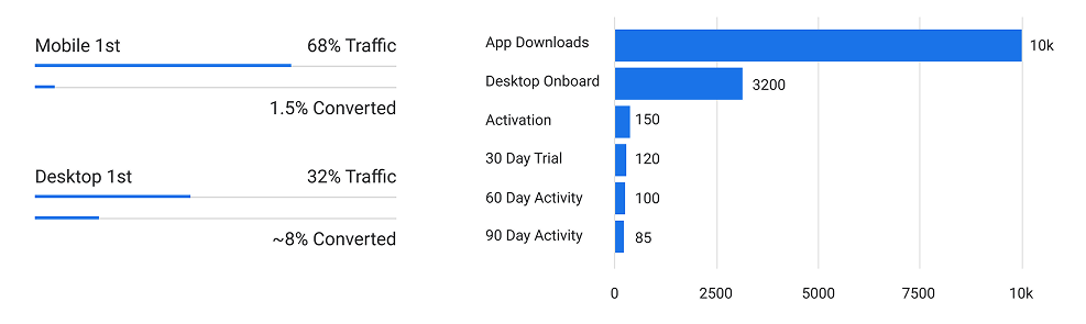 The aha moment is the first form submission. Everything before that is friction. The strategy: eliminate every step between download and first submission that required a desktop or a human. Mobile gets a straight line to aha. Desktop longtail search was already working, users finding specific form templates through search and converting without help.
