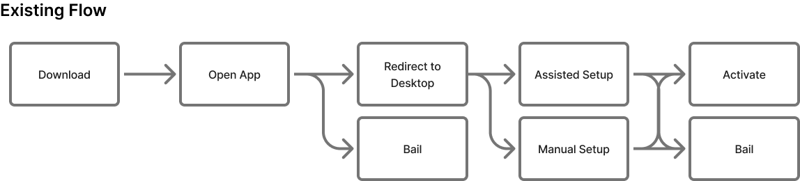 Surveyed CSMs and AMs to map where customers were getting stuck. The pattern was consistent, every manual onboarding started the same way, someone downloaded the app, hit a desktop setup prompt, and stopped. GA funnel data confirmed it. 1.5% of downloads converted without human intervention. Desktop conversions were higher but still not good. Mobile was the broken entry point, and that's exactly who Canvas was built for.